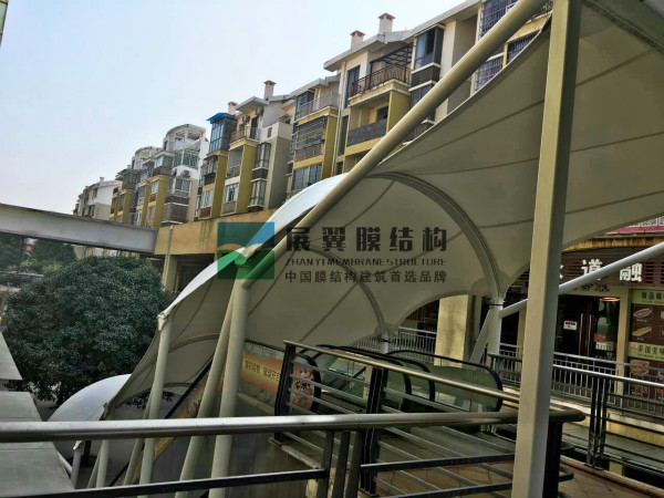 江西贛州萬盛廣場室外1-5號電梯張拉膜雨棚工程均已完工,雨棚設計為拱形起伏形狀,底部由鋼管支撐,結構穩(wěn)固美觀大方,工程采用德國進口白色膜材。