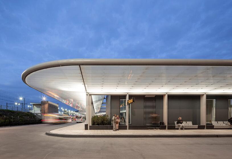 車站由一系列非常薄的柱子組成,頂部是一個(gè)簡(jiǎn)約的遮陽(yáng)蓬結(jié)構(gòu),形成了中心開放,長(zhǎng)度超過(guò)160米的三角形流線。汽車??奎c(diǎn)沿著外側(cè)布置,共有6個(gè)上車點(diǎn)1個(gè)下車點(diǎn)。遮陽(yáng)篷結(jié)構(gòu)總體寬度為14到30米,結(jié)構(gòu)功能齊全與城市環(huán)境相協(xié)調(diào),寬闊的遮陽(yáng)蓬結(jié)構(gòu)完全覆蓋了整個(gè)公共汽車站臺(tái)和??科嚨囊徊糠郑虼寺每涂梢酝耆谡陉?yáng)避雨的情況下上下車。