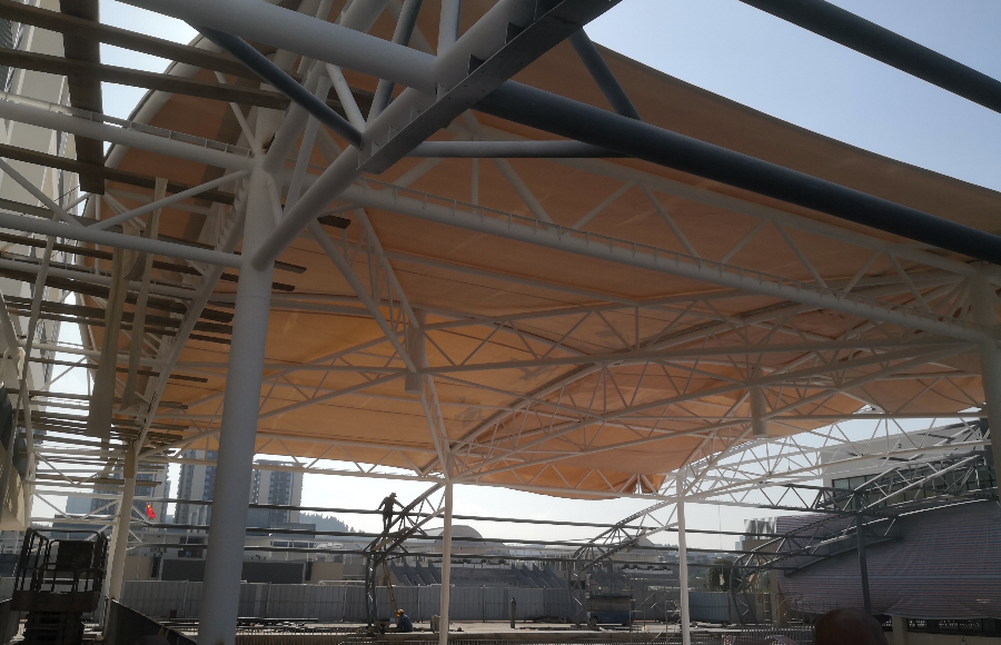 四川德陽(yáng)青衣江路學(xué)校風(fēng)雨操場(chǎng)膜結(jié)構(gòu)項(xiàng)目已完成鋼結(jié)構(gòu)安裝,目前正進(jìn)行膜材覆蓋工作。