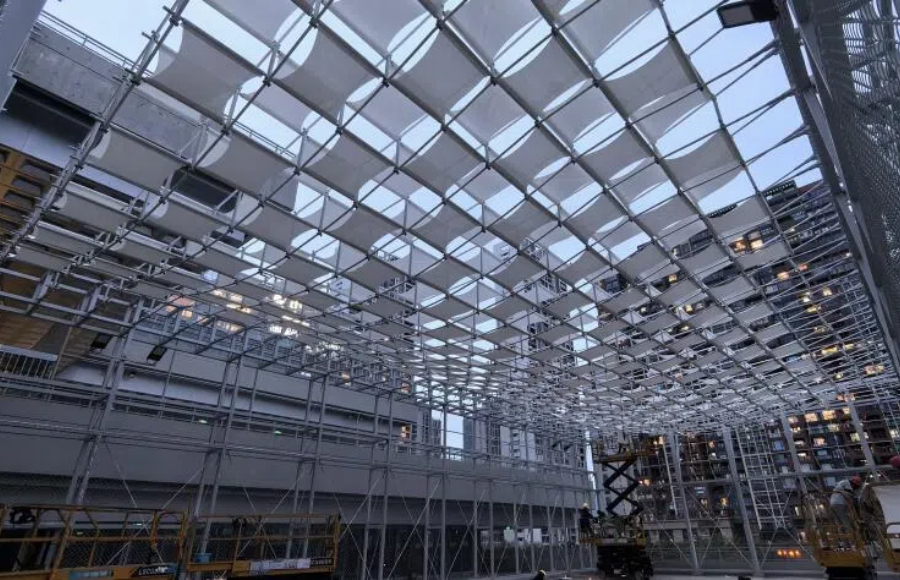 深圳蛇口文體公園籃球場膜結(jié)構(gòu)屋頂工程正在施工當中,鋼結(jié)構(gòu)已全部完成,目前進行膜材的安裝。該球場屋頂設(shè)計與眾不同,是由多個正方形的“膜”塊組成,這些“膜”塊之間可以相互融合、協(xié)調(diào)和平衡,從而形成了一個完整的建筑結(jié)構(gòu)。
