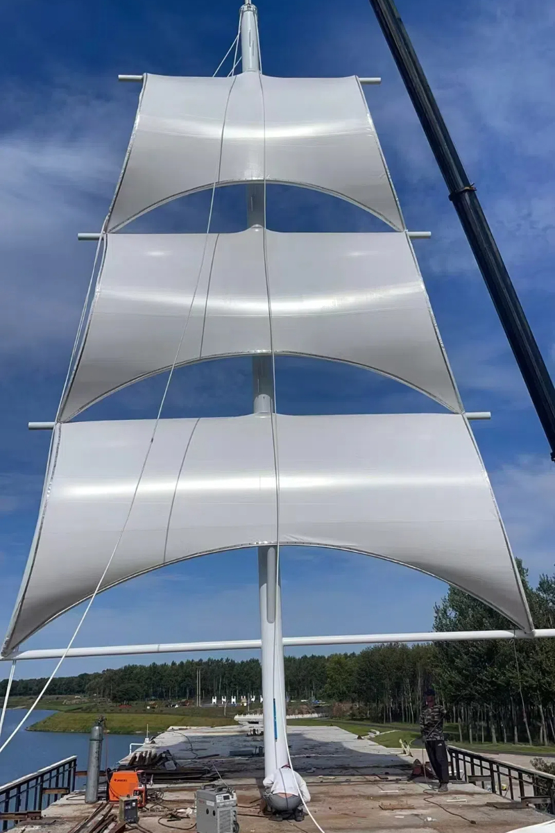 黑龍江省鐵力市景觀膜結(jié)構(gòu)工程“風(fēng)帆”已接近完工,工程以“風(fēng)帆”為靈感設(shè)計了一組景觀裝置,豎起的鋼管桅桿,膜材張拉出風(fēng)帆形狀,似一艘巨輪揚(yáng)帆啟航。