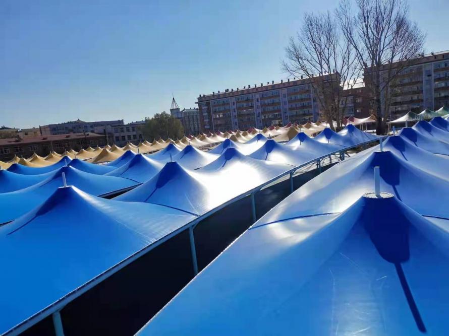 黑龍江鐵力經(jīng)開區(qū)集市大棚膜結(jié)構(gòu)工程采用白、紅、黃、藍、綠五色膜材打造,加上尖頂造型,顯得十分壯觀。