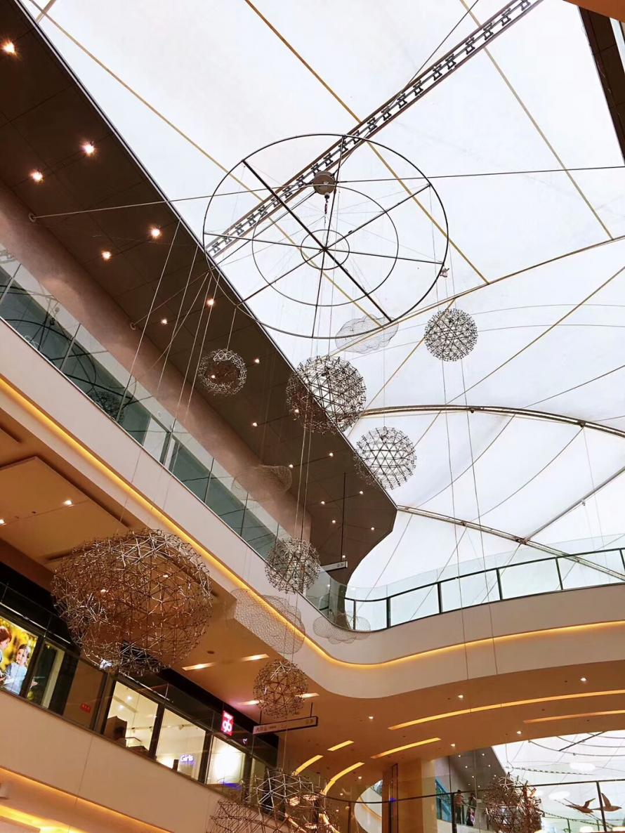 超萬平米大跨度膜結(jié)構(gòu)天幕,覆蓋整個中庭位置,拉膜結(jié)構(gòu)的張力跟脈絡(luò)展示了新材料的優(yōu)勢,在燈光的映襯下膜面色彩豐富,給您溫馨秀雅的感覺。該工程由本公司承建。