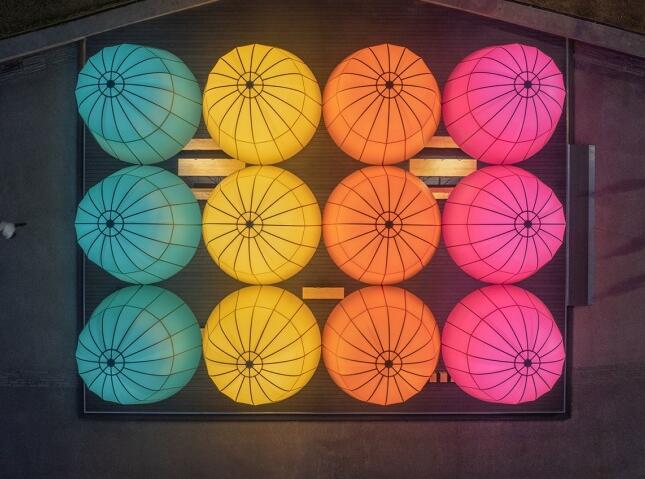 亭子穹頂部由彩色半透明的膜材料包裹,設計師希望材料能夠呈現類似紙張的質感,光線可以穿透;其防水性也使亭子成為了雨天的臨時遮蔽場所。日間,透光材料遮蔽部分陽光,保證了亭下空間的舒適性;而在夜晚,點亮后的光亭多彩且柔和,成為城市晚間絕佳的公共活動空間。