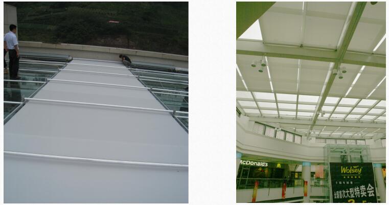為滿足商業(yè)建筑造型及采光、節(jié)能的要求,玻璃幕墻及大跨度鋼架玻璃屋面被大量使用。因玻璃幕的高透光性,為了提高商業(yè)內(nèi)部環(huán)境的舒適感,常采用美觀、便捷靈活而又遮光隔熱的電動遮陽卷簾。