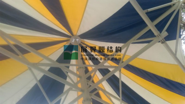 深圳觀瀾湖體育公園出入口景觀張拉膜工程目前正在進(jìn)行膜材的安裝施工,藍(lán)白黃三色膜材覆蓋于已安裝的鋼結(jié)構(gòu)之上,等待專業(yè)人員的拉伸及平整工作,整個(gè)造型似一把大傘,成為該公園出入口的標(biāo)識建筑。