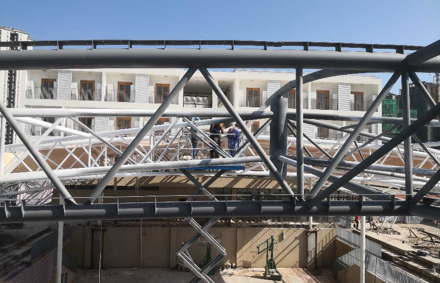 四川德陽(yáng)青衣江路學(xué)校風(fēng)雨操場(chǎng)膜結(jié)構(gòu)項(xiàng)目已完成鋼結(jié)構(gòu)安裝,目前正進(jìn)行膜材覆蓋工作。