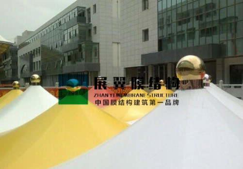 蘭州金牛街張拉膜結(jié)構(gòu)天井工程也是獨(dú)具特色的一道風(fēng)景,紅黃白三種膜材錯(cuò)落搭配,帽頂采用金黃色小球點(diǎn)綴,造型設(shè)計(jì)方面新奇有趣,工程喜獲客戶好評。近年來膜結(jié)構(gòu)工程在美化環(huán)境方面的優(yōu)勢逐漸凸顯,從大型膜結(jié)構(gòu)建筑到小型景觀小品工程,這種結(jié)構(gòu)似乎都能很好的適用,它塑造的靈活多變時(shí)尚靚麗的形狀往往給人留下深刻印象。天井張拉膜屬于屋頂遮陽膜結(jié)構(gòu)系列產(chǎn)品,常應(yīng)用于私人小花園、酒店休閑中庭、商業(yè)街露天空地等場所。