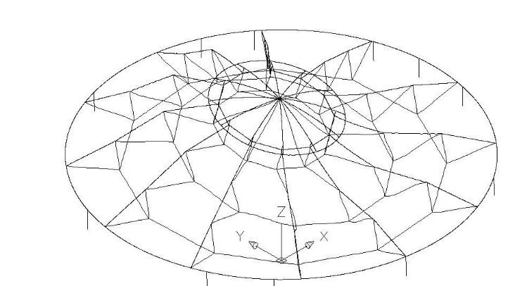 定義一下結(jié)構(gòu)各構(gòu)件的名稱,分別為內(nèi)環(huán)、外環(huán)、脊索1~3、環(huán)索1~3、斜索1~3、撐桿1~3,如圖2所示。邊界條件是確定的,即外環(huán)直徑33.4米、內(nèi)環(huán)直徑9米。而穹頂?shù)氖父?、每根索的預(yù)拉力是未知的。初始形態(tài)設(shè)計(jì)就是要尋求滿足邊界條件、在合理的預(yù)拉力分布下,結(jié)構(gòu)的外形包括矢高。所謂合理的預(yù)拉力,就是預(yù)拉力不能太小也不能太大。太小,剛度不足,在荷載作用下結(jié)構(gòu)變形不能滿足規(guī)范要求;太大,桿件強(qiáng)度又不能滿足規(guī)范要求,無休止的加大截面又會造成用鋼量增加。因此,這是一個假定預(yù)拉力分布、找形、受荷計(jì)算、調(diào)整預(yù)拉力分布、再找形、再受荷計(jì)算,直至循環(huán)到合理的預(yù)拉力分布及其對應(yīng)的形狀的過程。